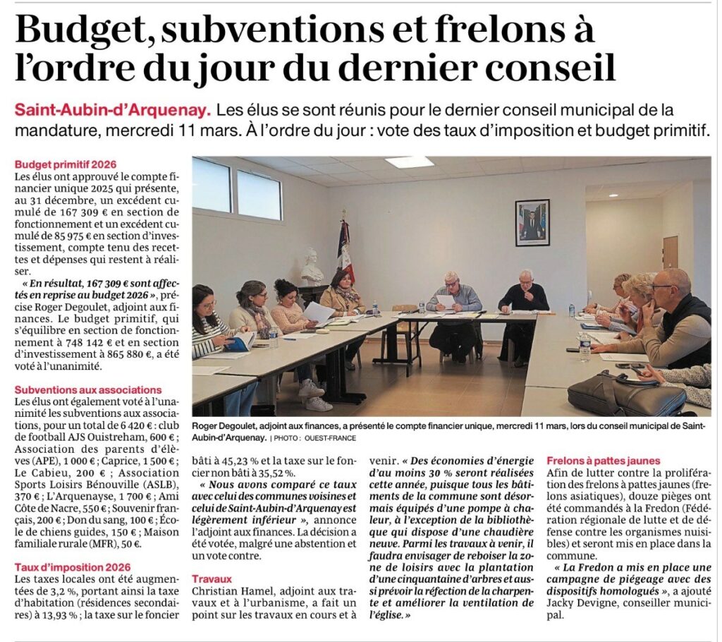Point Presse Ouest-France 21-03-2026 Ouest-France 18-03-2026 Ouest-France 12-03-2026 Ouest-France 26-01-2026 Ouest-France 13-02-2026 Ouest-France 24-01-2026 Ouest-France 19-01-2026 Liberté le bonhomme libre 15-01-2026 Ouest-France 14-01-2026 Ouest-France 06-01-2026 Ouest-France 22-12-2025 Ouest-France 20-12-2025 Ouest-France 29-11-2025 Ouest-France 15-11-2025 brassens 2025 Ouest-France 25-09-2025 Ouest-France 04-09-2025 Ouest-France 02-09-2025 Ouest-France 05-07-2025 Ouest-France 27-06-2025 Ouest-France 26-06-2025 Ouest-France 25-06-2025 Ouest-France 04-06-2025 Ouest-France 30-05-2025 Liberté le bonhomme libre 29-05-2025 Liberté le bonhomme libre 27-11-2024 Ouest-France 20-11-2024 Ouest-France 29-10-2024 Liberté le bonhomme libre 24-10-2024 Ouest-France 01-10-2024 Liberté le bonhomme libre 30-11-2023 Ouest-France 16-09-2024 Ouest-France 06-09-2024 Ouest-France 02-09-2024 Ouest-France 26-08-2024 JUKEBOX 27-07-2024 Liberté le bonhomme libre 13-06-2024 Ouest-France 07-06-2024 Ouest-France 31-05-2024 Ouest-France 18-05-2024 Ouest-France 17-05-2024 Ouest-France 08-05-2024 Ouest-France 06-05-2024 Ouest-France 09-04-2024 Liberté le bonhomme libre 04-04-2024 Ouest-France 30-03-2024(2) Ouest-France 30-03-2024 Liberté le bonhomme libre 28-03-2024 Liberté le bonhomme libre 14-03-2024 Liberté le bonhomme libre 29-02-2024 Liberté le bonhomme libre 29-02-2024(2) Liberté le bonhomme libre 29-02-2024(3) Ouest-France 27-02-2024 Ouest-France 28-02-2024 Liberté le bonhomme libre 08-02-2024 Liberté le bonhomme libre 01-02-2024 Ouest-France 20-12-2025 Liberté le bonhomme libre 01-02-2024 (2) Ouest-France 22-01-2024 Ouest-France 04-12-2023 Ouest-France 02-12-2023 Ouest-France 15-11-2023 Ouest-France 04-11-2023 Ouest-France 03-11-2023 Liberté le bonhomme libre 25-09-2025 octobre rose 2023 (1) Liberté le bonhomme libre 21-09-2023 Ouest-France 16-09-2023 oUEST-fRANCE 09-09-2023 Liberté le bonhomme libre 31-08-2023 Ouest-France 31-08-2023 Ouest-France 10-08-2023 Ouest-France 21-08-2023 Liberté le bonhomme libre 27-07-2023 Ouest-France 14-07-2023 Ouest-France 13-07-2023 Ouest-France 06-07-2023 Ouest-France 06-06-2023 Ouest-France 05-06-2023 Ouest-France 27-05-2023 Ouest-France 13-04-2023 Liberté le bonhomme libre 11-05-2023 Ouest-France 07-04-2023 Ouest-France 01-04-2023 Liberté le bonhomme libre 23-03-2023 Liberté Le bonhomme libre 16-03-2023 (2) Liberté Le bonhomme libre 16-03-2023 Liberté Le bonhomme libre 16-03-2023 (3) Ouest-France 14-03-2023 Ouest-France 13-03-2023 Ouest-France 10-03-2023 Ouest-France 07-03-2023 Ouest-France 30-01-2023 Ouest-France 26-01-2023 Ouest-France 20-01-2023 Ouest-France 05-11-2022 octobre rose 14-11-2022 Ouest-France 27-10-2022 Ouest-France 11-10-2022 Ouest-France 06-10-2022 Ouest-France 26-09-2022 Ouest-France 16-09-2022 Ouest-France 24-08-2022 Ouest-France 19-08-2022 Ouest-France 29-07-2022 Ouest-France 06-07-2022 Ouest-France 14-06-2022 Ouest-France 07-06-2022 Ouest-France dawson 07-06-2022 Ouest-France lofi 07-06-2022 Ouest-France 23-05-2022 Liberté le bonhomme libre 05-05-2022 Ouest-France 02-05-2022 Ouest-France 27-04-2022 Ouest-France 04-04-2022 Ouest-France 30-03-2022 Ouest-France 21-03-2022 Ouest-France 09-03-2022 Ouest-France 16-03-2022 Ouest-France 11-03-2022 Ouest-France du 09-03-2022 Ouest-France 07-03-2022 Ouest-France 02-03-2022 article Ouest-France du 25-02-2022 Saint-Aubin d’Arquenay – Le château prend forme Ouest-France 27-01-2022 Ouest-France 10-12-2021 Ouest-France 06-12-2021 Ouest-France 04-10-2021 ARTICLE OUEST FRANCE DU 22/06/2021 – DEPART ANNICK ARTICLE 14-06-2021 ARTICLE DU 05-06-2021 Ouest-France 29-04-2025 Liberté le bonhomme libre 03-04-2025 Ouest-France 01-04-2025 Ouest-France 27-10-2025 Ouest-France 27-01-2025 Ouest-France 23-01-2025 Ouest-France 22-01-2025 Ouest-France 21-12-2024 Ouest-France 04-12-2024 Ouest-France 03-12-2024 Contact mairie Horaires d’ouverture Mardi : 17h-19h Mercredi : 10h-12h et 15h-17h Vendredi : 12h-14h Adresse 12 Rue du Bac du Port14970 – Saint Aubin d’Arquenay Téléphone 02 31 97 18 50 Mail contact.mairie@saintaubin darquenay.fr